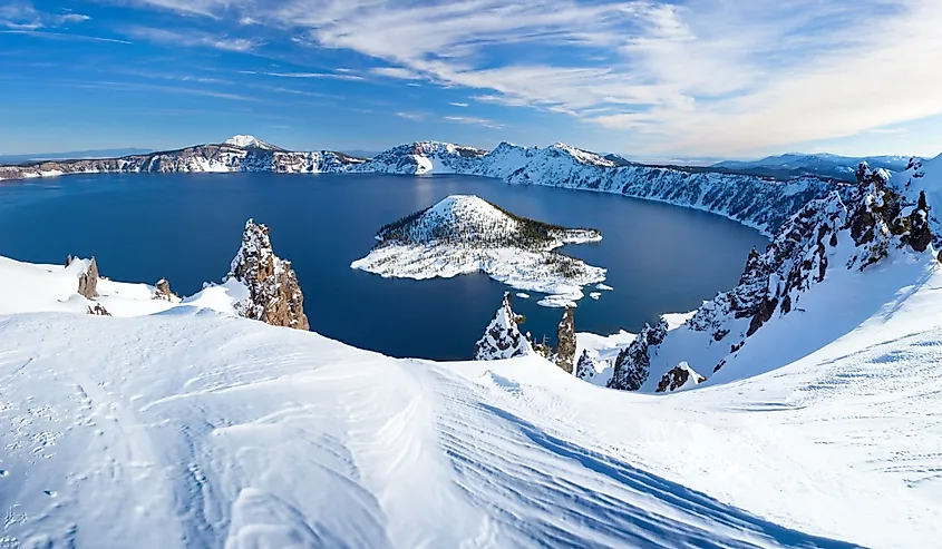 クレーター湖は、カナダのブリティッシュ コロンビア州から北カリフォルニアまで広がる火山列であるカスケード山脈内にあります。具体的にはオレゴン州南部、カリフォルニア州境からそれほど遠くない場所にあります。幅わずか 6 マイルのこの湖は、驚くべきことに米国で最も深い湖で、最大深さは 649 フィートです。