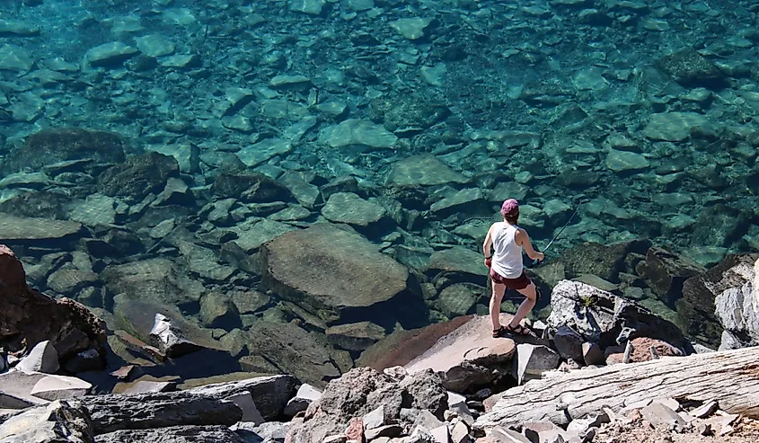 オレゴン州クレーターレイク国立公園のクリートウッド入り江で釣り