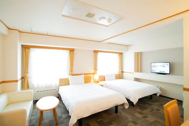 一緒にいてもプライバシーを保てるお部屋をお探しですか?東横INNホテル17軒の「ビジネスツイン」ルームは、まさにそれを提供します。通常のツインルームと同じようにベッドが2台ありますが、中央にバスルームがあり、各ゲストごとに独立したデスク、テレビ、冷蔵庫が備わっています。このセットアップは、上司と部下などの同僚が、プライベート感を保ちながら同じ部屋に手頃な料金で滞在したい場合に最適です。