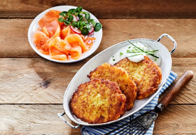 千切りジャガイモを使った大きなパンケーキ「ロスティ」は、スイスで朝食の選択肢として非常に人気があります。今ではレストランで終日提供されていますが。ポテトフリッターは単独で提供されるか、ベーコン、チーズ、玉ねぎ、目玉焼きに至るまでさまざまな材料を混ぜたものがトッピングされ、目玉焼きが上になることがよくあります。