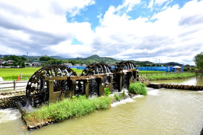 朝倉三連水車は今も農地を潤すために現役で活躍しています。 230年以上前に設置され、稼働している最古の水車として知られています。そのうち最大の車輪は高さ4.8メートルです。 1990年に堀川用水とともに国の史跡に指定されました。この水車は地元の職人たちによって5年ごとに再建され、伝統の技が受け継がれています。糸車は夏の風物詩なので、農繁期に訪れるのがおすすめです。