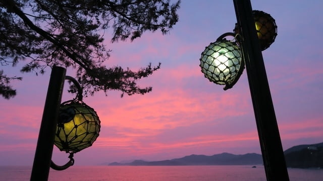 びんたまロードは、漁網の浮き標識として伝統的に使用されてきた「びんたま」(ガラス製の漁浮き)が並ぶ全長 1 キロメートルの海岸沿いの遊歩道です。最近ではインテリアとしても人気のびんたまですが、びんたまロードでは、日中は太陽の光を反射して道沿いにびんたまが点在しています。真っ青な海を背景に、透明度の高いガラスのフロートが幻想的で爽やかな光景を作り出します。