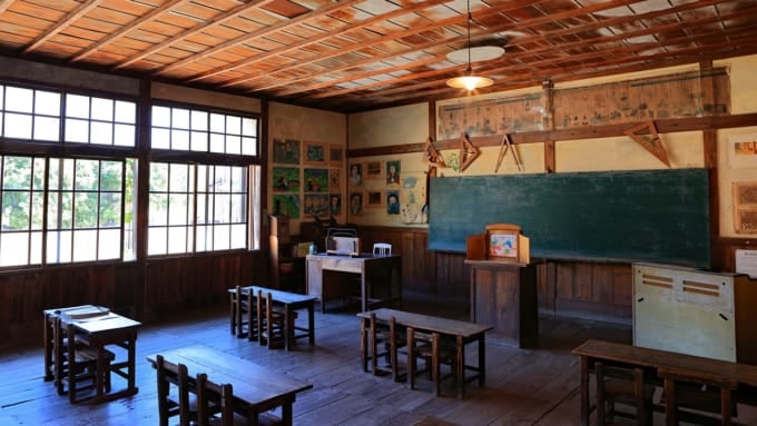 村には、古いshowa時代の村と木製の校舎のレプリカがあり、過去に子供たちが使用していた机、椅子、子供の作品を見ることができます。村には映画館、お土産のお店、レストランもあり、雨の日でもリラックスするのに最適な場所です。