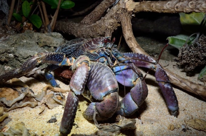 洞窟の入り口の近くで、巨大なココナッツカニに迎えられます。その名前にもかかわらず、ココナッツのカニは実際にはカニではなく、陸上のcrabに分類されます。彼らの爪は非常に強力なので、指に向かって指を伸ばさないように注意してください。