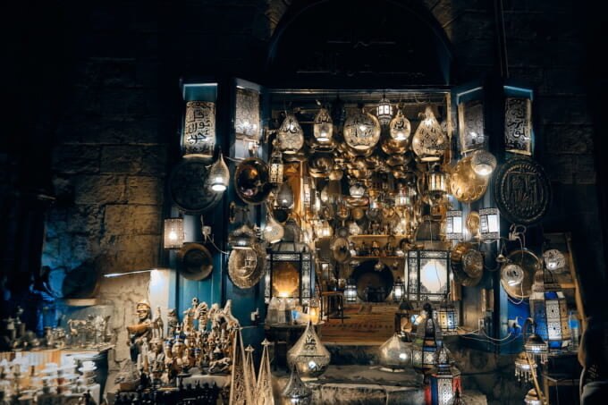 曲がりくねった狭い通りには、金や銀の工芸品、ガラス製品、革製品、香水、パピルス、シーシャ用品など、エジプトの定番土産を販売する店が並んでいます。観光客に最も人気のあるアイテムの 1 つは、美しい香水瓶のセットです。価格交渉の準備をしてください!