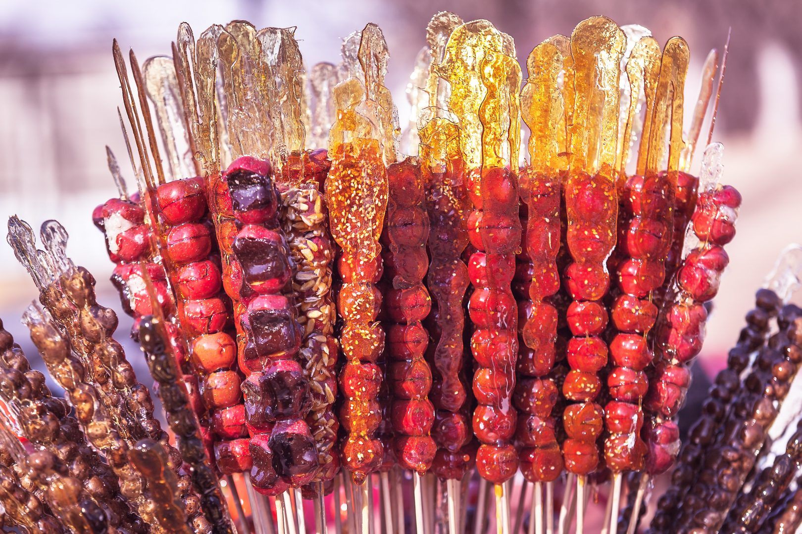 大きな夕食の後に甘いものが必要な場合は、中国人のおやつはタングルーです。串焼き果物(ブドウ、ホーソーン、イチゴ)は、結晶化して硬化する甘いシロップに浸されています。この砂糖漬けの御treat走は、800年以上前に最初に作成されましたが、消化の問題を支援すると信じられています。