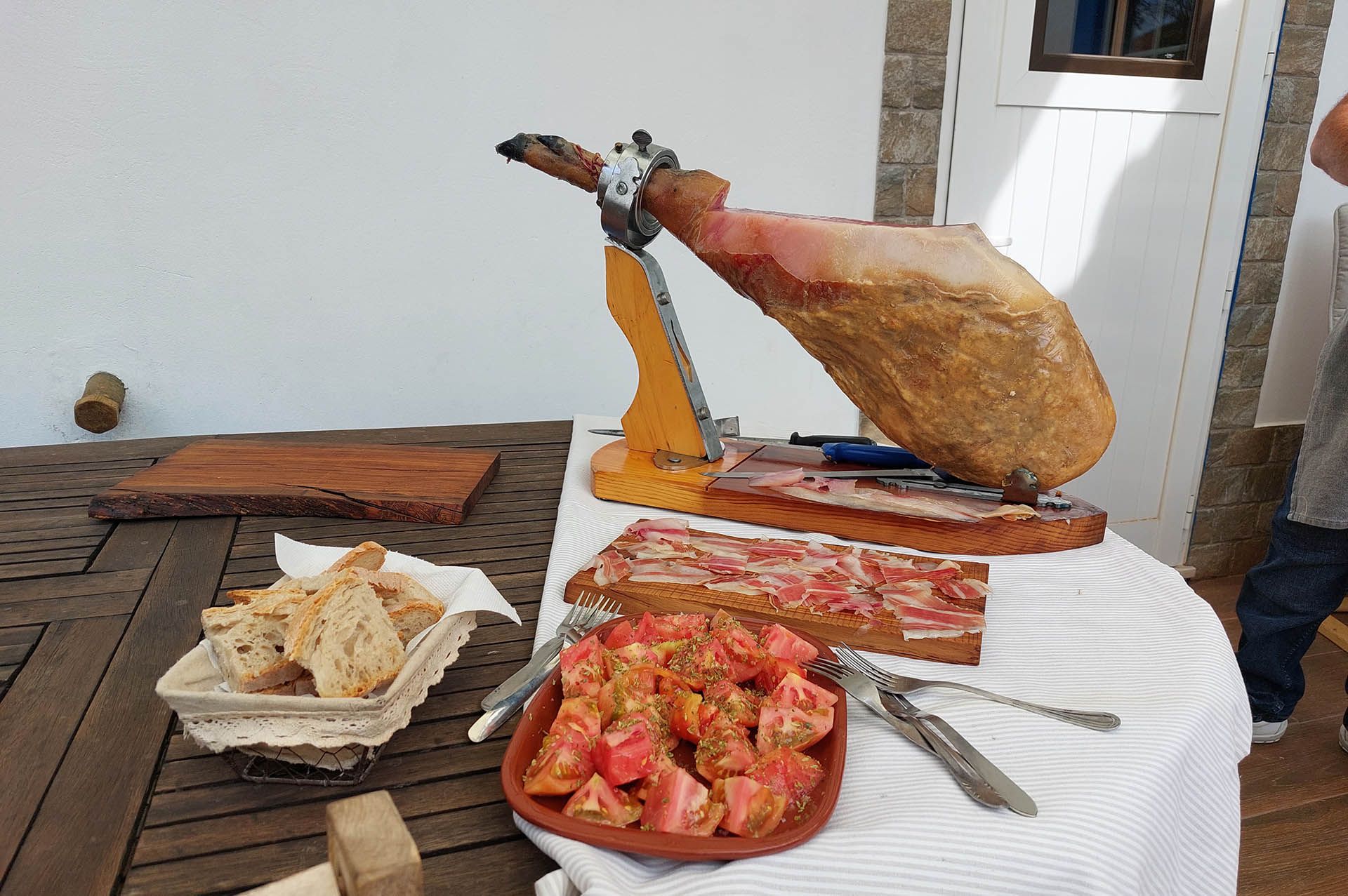 フリーローミングブタで満たされた農場の広大な畑の短いツアーの後、私たちは忘れられない食事を扱います。メニューは、バルサミコ、炎に覆われた首の切れ目で服を着たおいしいチョリソで構成されており、手作りのワインを添えています。