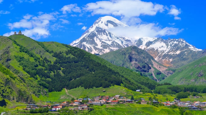 カズベク山は、ジョージアと北オセチアの国境にある成層火山です。これはシュハラ山脈とコーカサス山脈に次いでジョージアで3番目に高い山です。この山の標高は約 16,516 フィートで、登ったり下ったりするには約 8 日かかります。ハイキングしたい場合は、標準的な氷河装備と防風服が必要です。最も暑い夏の日でも気温が-20℃まで下がることもあるため、暖かい服装が必須です。気弱な人向けではないので、頂上まで登りきると格別の達成感が得られます。山の頂上からはジョージアとロシアを眺めることができます。