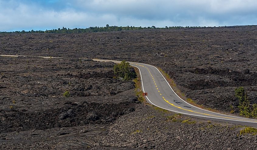 ハワイ火山国立公園の溶岩地帯を切り裂くクレーターの連鎖道路