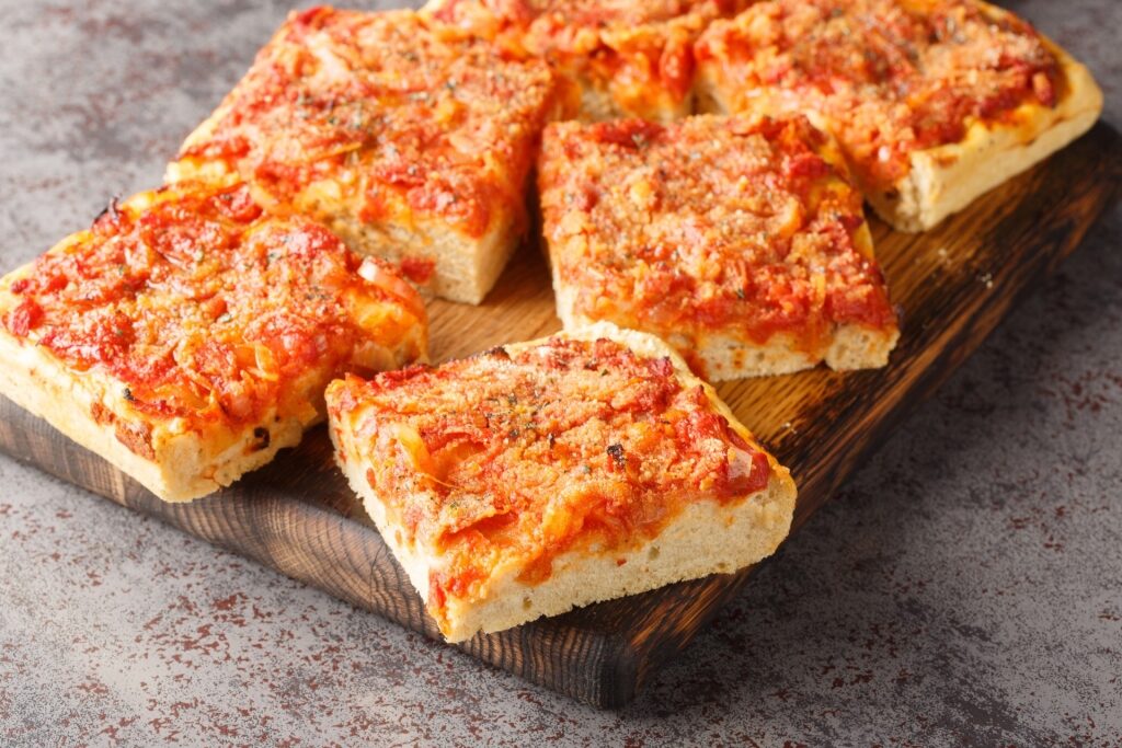 Sfinciuni は、シチリア独特のピザです。パレルモではさらに人気があり、この深皿スタイルのいとこが都市部の屋台の食べ物として販売されています。ふわふわでありながらオリーブオイルでカリカリとしたこの長方形のピザは、古代ギリシャ人のフラットブレッドから発展しました。