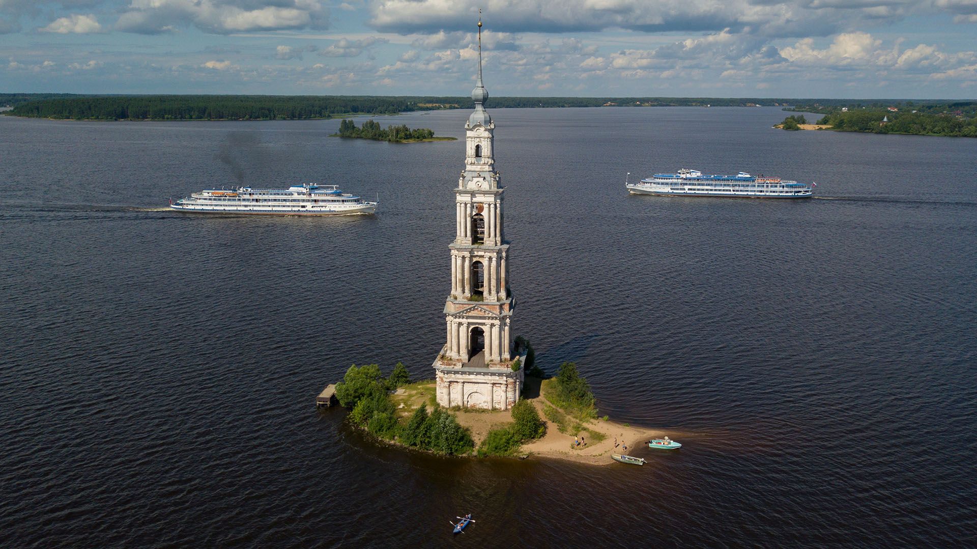有名なカリャジン鐘楼を通過する船 © Elena Ignatyeva/Shutterstock