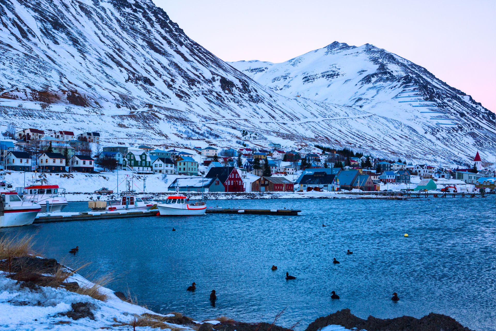 夜明けのシグルフィヨルズル港 © Nella / Shutterstock