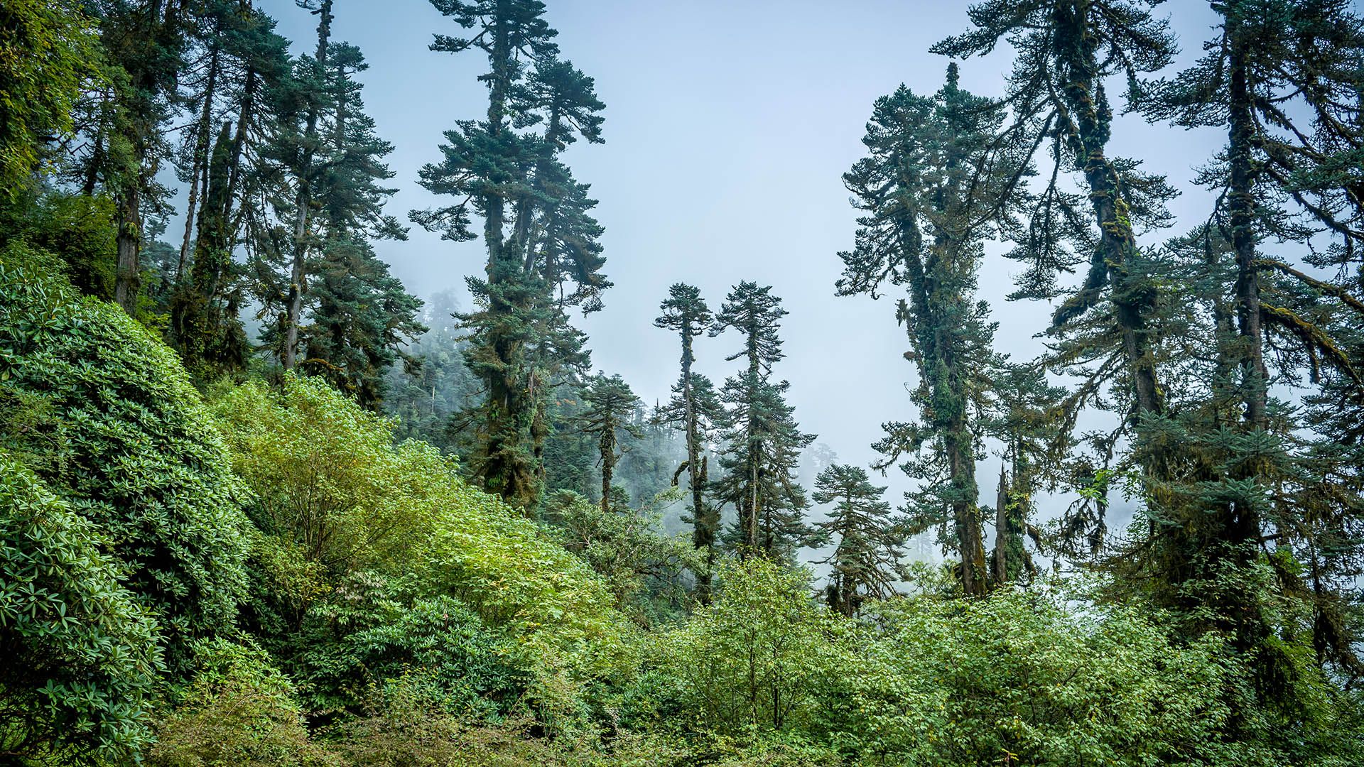 インド、シッキムのカンチェンジュンガ国立公園に背が高い緑豊かな低木と松の木