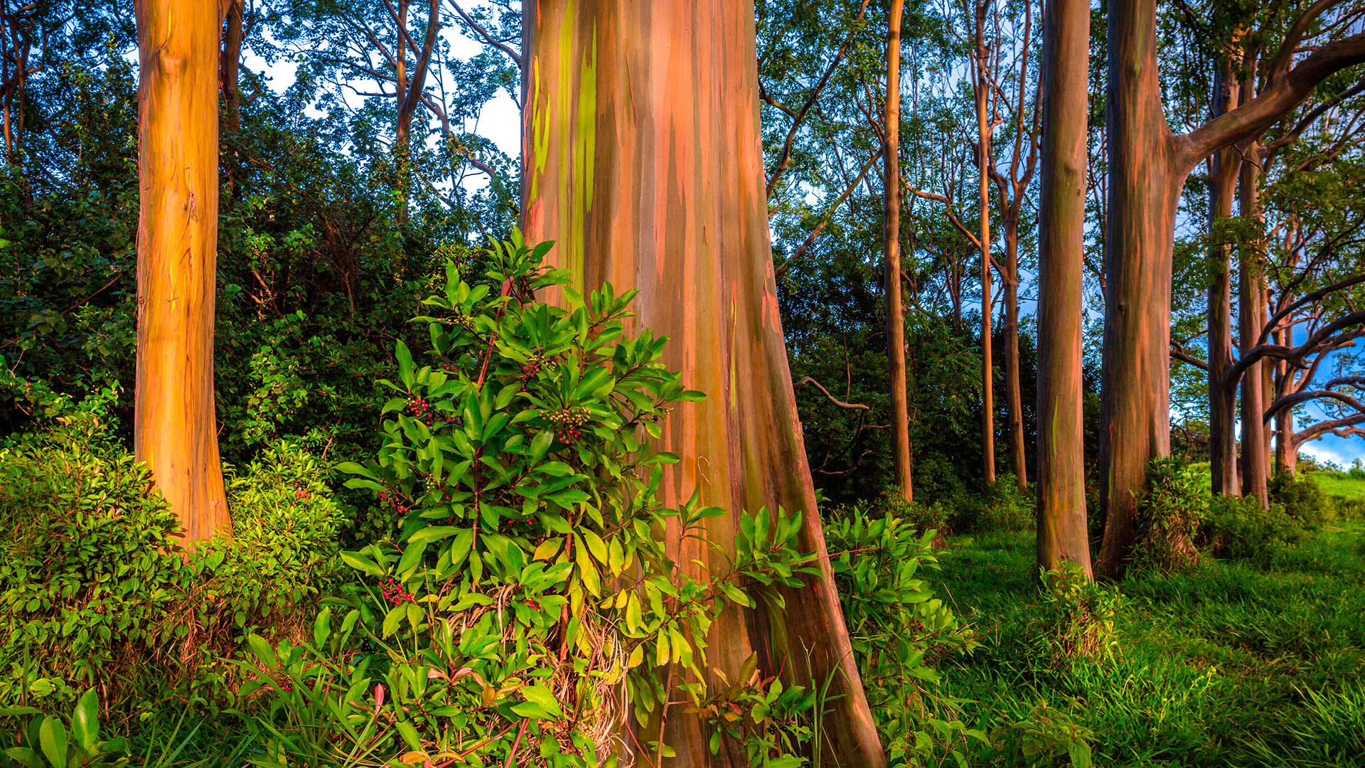 クルーズマウイのハナハイウェイとして滑走路に目を向けるのは難しいです。道端に沿って、虹のユーカリの木の素晴らしい木立があります。名前が示唆するように、木の樹皮は夏に剥がれて、赤、琥珀、緑の美しい交通光色のリボンを明らかにします。木の幹が雨から濡れて、色が本当にポップになると、景色はさらに驚くべきものです。