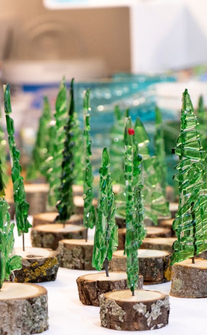 チチェスターのアーティストであるアン・マーシャルが作ったボトルグラスの松の木のミニチュアの森©Gemma Lake