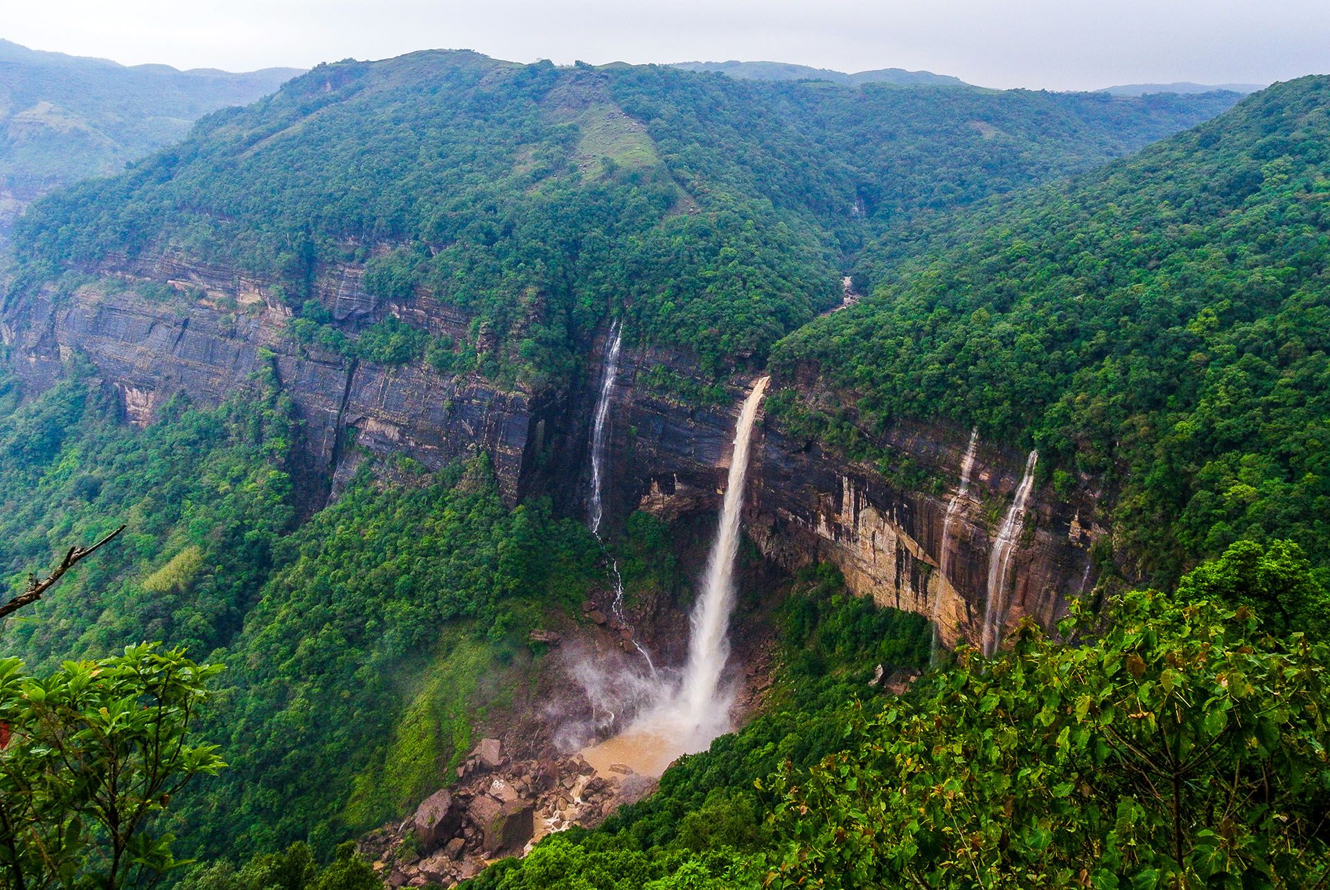 セブン シスターズ滝としても知られるノーカリカイ滝は、世界で最も雨の多い場所の 1 つであるメガラヤ州にあります (イギリス統治時代、この地域は「東洋のスコットランド」というあだ名が付けられていました)。バングラデシュとブータンの間に位置するメガラヤ州は、「雲の住処」を意味します。この豊富な降水量が滝の壮観な効果を生み出します。