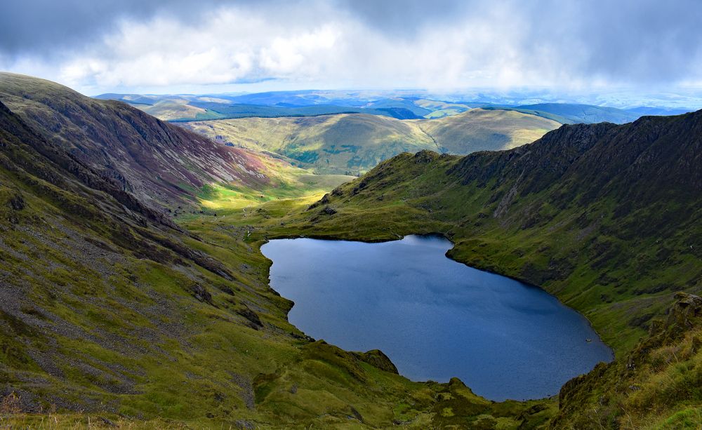 身長2930フィートのスノードンの頑丈で背の低い兄弟、カデア・イドリスは、身長に足りないものを見た目で補っている。伝説によれば、頂上で一夜を過ごすと死ぬか、詩人になるか、発狂するかも知れないが、ここからの眺めは驚くべきもので、河口と海の溶けた金属の破片が緑のパッチワークを遮っている。