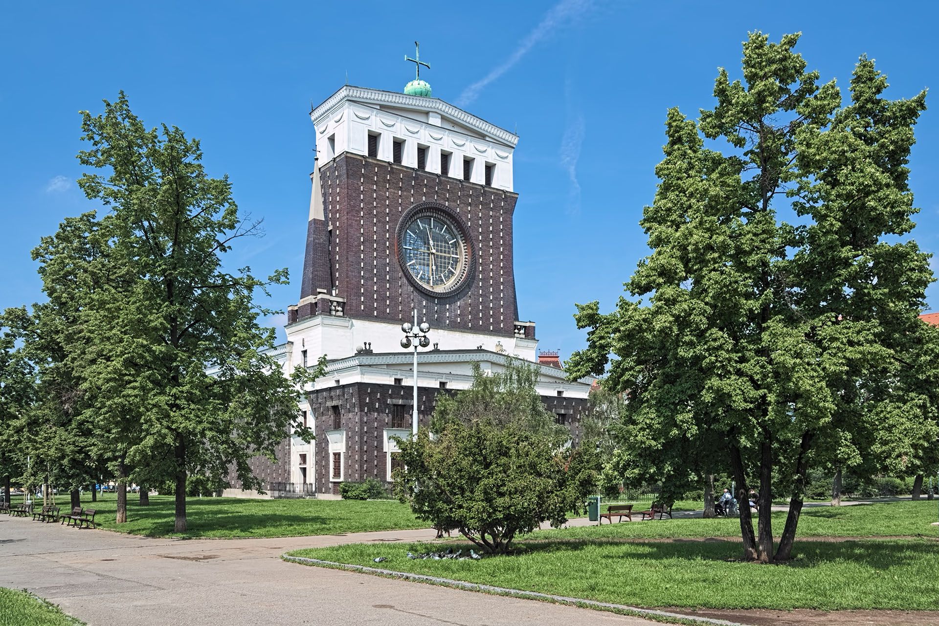 地下鉄 A 線に乗って Jiřího z Poděbrad 駅まで行くと、ますますファッショナブルになりビルが密集したヴィノフラディ地区に出ます。場所によっては多少薄汚れていますが、雰囲気と歴史的魅力に満ちており、プラハでの滞在に最適な場所の 1 つとなっています。近くには、1932 年に建てられたモダニズムの聖心教会があり、墓石の形をした特徴的な時計塔があります。