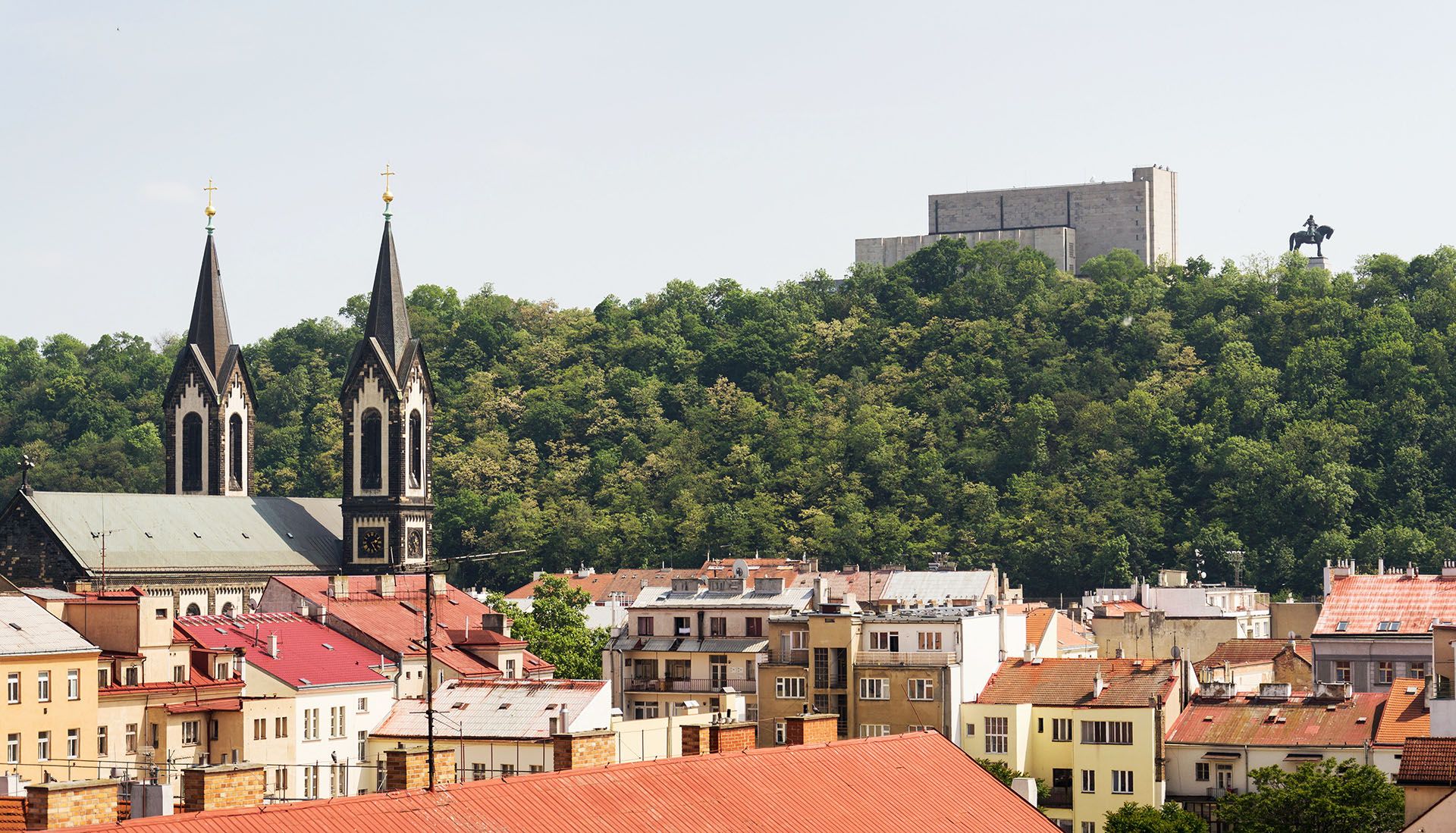 晴れた夏の日、チェコ共和国、前景に聖キリルとメトディウス教会があるカーリン地区、国立記念碑ヴィトコフの前にあるヤン・ジシュカ騎馬像のあるプラハのパノラマ © Shutterstock