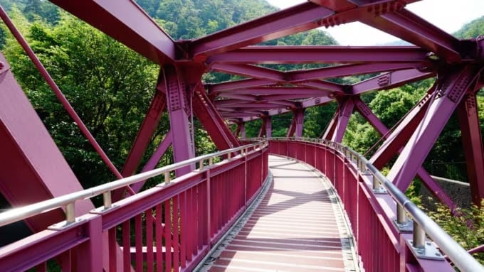 約1300年の歴史を持つ山中温泉も、山代温泉と同じく加賀市にあります。町の中心を流れる大聖寺川沿いには美しい景色を望む旅館が建ち並んでいます。ユニークなデザインの「あやとり橋」と、川にかかるシンボルの「こおろぎ橋」が観光スポットとして知られています。