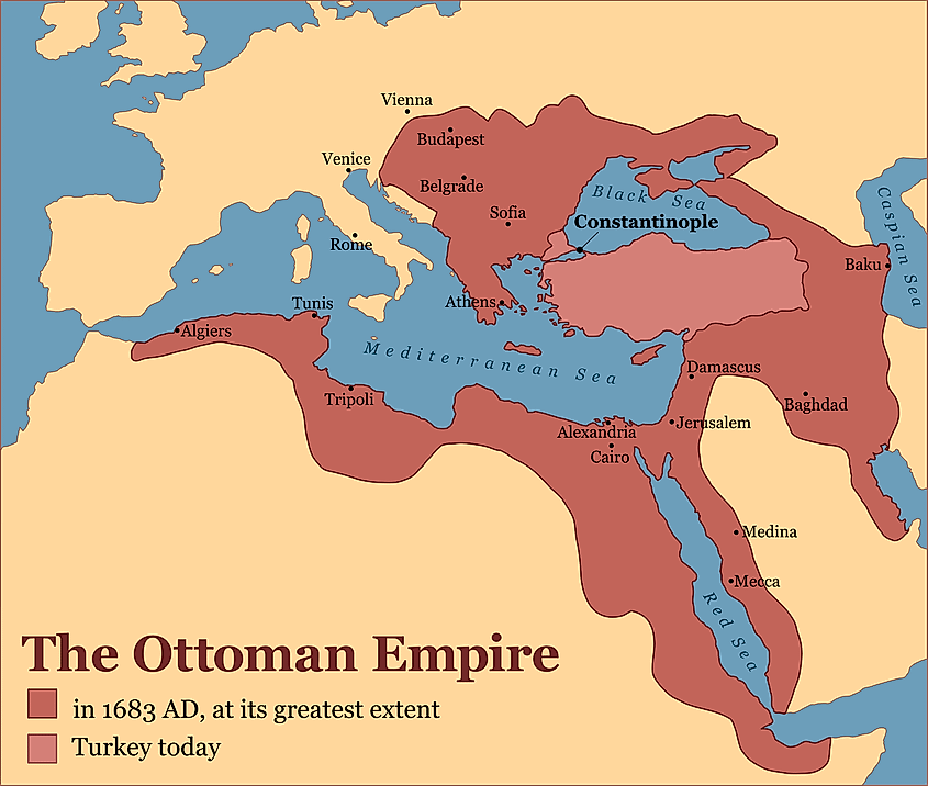 1683年に最大規模を誇ったオスマン帝国と今日のトルコ。