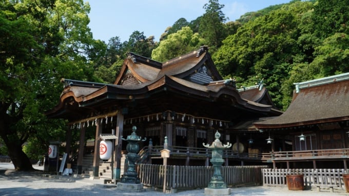 785段の石段を登ると、大物主神を祀る本殿に到着します。標高251メートルに位置する神社は、大社造り、檜皮葺の壮大な建造物が特徴です。主祭神は大物主神が有名ですが、崇徳天皇も祀られています。農業、工業、医学などさまざまなご利益がある神ですが、特に海の神として崇められています。