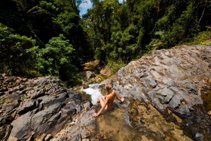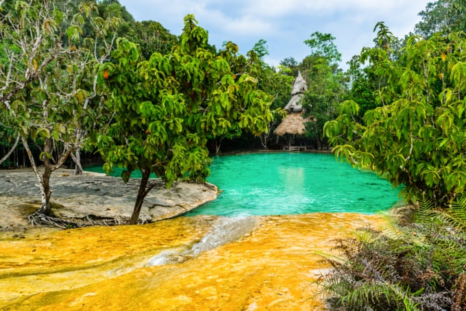 エメラルドプールは、自然の中にある美しい天然プールです。このエリアは緑豊かな植生と木々に囲まれており、エメラルド色の海を際立たせています。透き通った水は、目にも体にもとてもリフレッシュできるのでとても魅力的です。暑い日には、涼むためにプールを訪れる観光客や地元の人で賑わいます。体の死んだ皮膚を食い荒らす小魚がいますが、これは治療効果があると考えられています。訪れるのに理想的な時間帯は、それほど混雑していない正午前の午前中です。