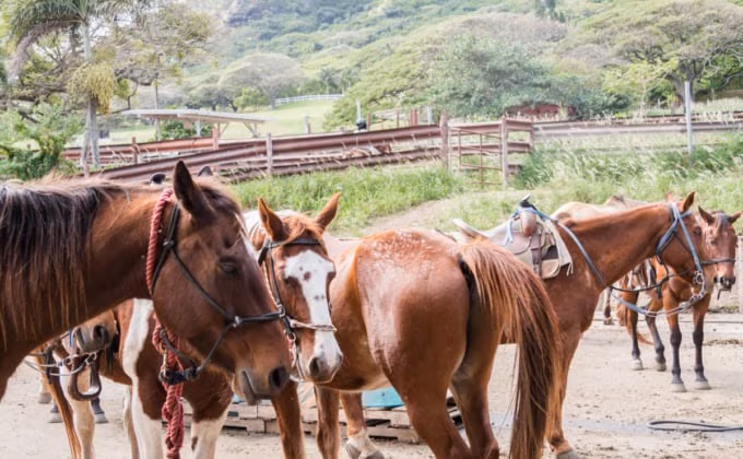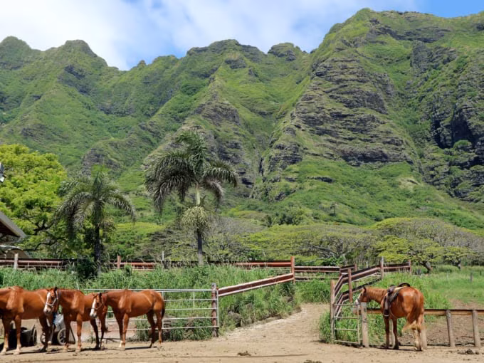 クアロア ランチはワイキキから約 40 キロ、車で約 50 分の距離にあります。まず、H1 を西行きに乗り、約 9 キロメートル進んだところで Likelike Highway に合流します。北に 12 キロメートル進み、カヘキリ ハイウェイに入ります。道なりに西へ進むと到着します。 100台収容可能な駐車場をご用意しております。