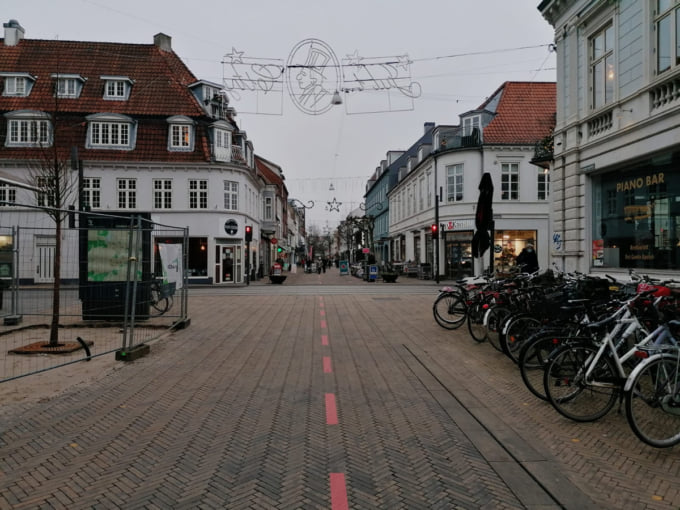 これらの赤い線は、オーデンスの歩行者のショッピング通りをずっと通り抜けます。彼らは、買い物客に通りの右側を歩くように思い出させるはずです。