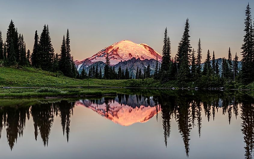 ワシントン州マウント・レーニア国立公園のティプスー湖の穏やかな水面に映るレーニア山。
