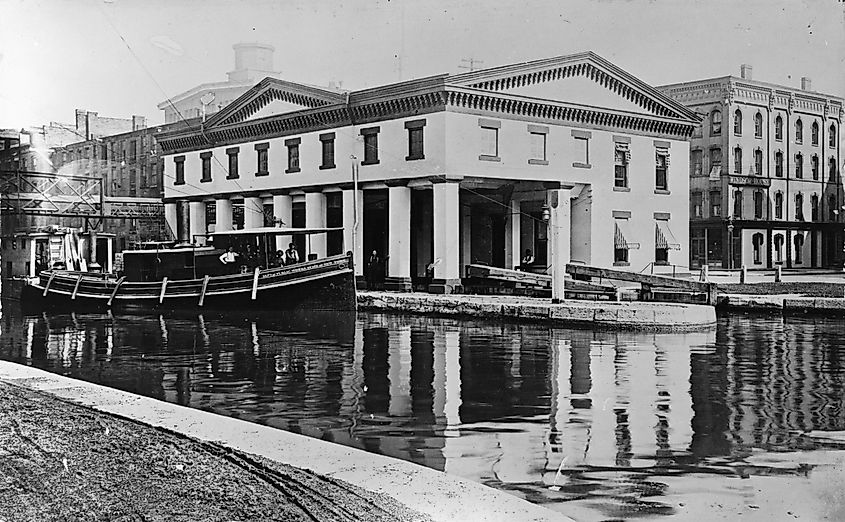 運河ルートに沿って、村々は事実上一夜にして都市になりました。ロチェスターの住民は 1815 年にはわずか 331 人でしたが、1827 年には 8,000 人以上に爆発的に増加し、ジェネシー川沿いの工場が西部の農場からの小麦を加工したため、「小麦粉の街」というあだ名が付けられました。バッファローの人口は、1820 年の 2,095 人から 1850 年までに 42,261 人に増加しました。シラキュースは主要な塩の生産者として浮上しました。一方、ユティカは重要な繊維製造の中心地となりました。