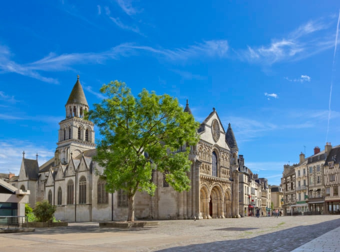 ポワティエ市の中心部にある印象的なノートルダム ラ グランド教会は、ロマネスク建築の傑作の 1 つと考えられており、この地域では非常に一般的な建築様式です。この教会は、12 世紀のファサードが特に印象的です。豊かな装飾が施されたこのファサードは、石に刻まれた実際の物語の頂点に、アダムとイブからキリストの栄光に至る聖書の歴史全体をたどります。