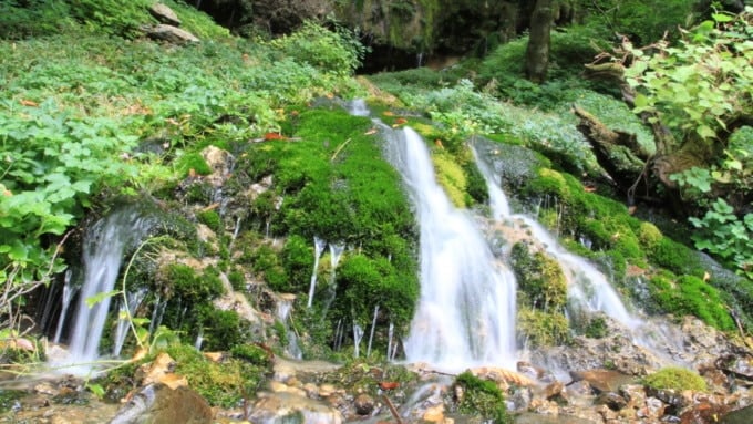 白骨温泉観光センターから少し歩くと龍神の滝に到着します。苔むした岩の上を水が滑らかに流れる様子は、幻想的で幻想的です。