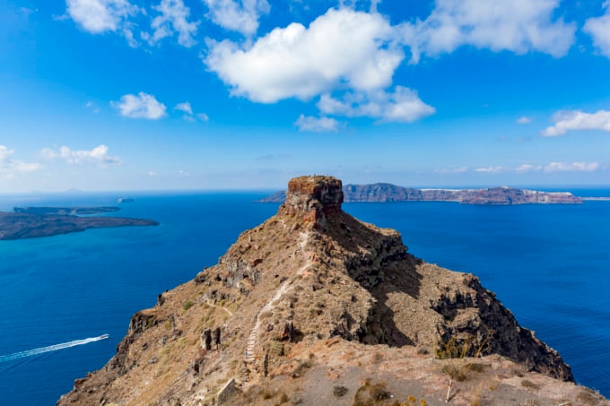スカロスは、サントリーニ島周辺にある 5 つの要塞の中で最も重要な要塞です。この岩には中世に人が住んでおり、この地域を航行する海賊から身を守る役割を果たしていました。頂上からは、日没時の非常に美しい景色を含むカルデラの素晴らしい景色を眺めることができます。地形は主に緩い岩であり、そこに行くまでに少し急な坂がある場合があるため、訪問する前に体力があることを確認してください。スカロス岩には今も無人が残っていますが、頂上には小さな教会がまだ立っています。