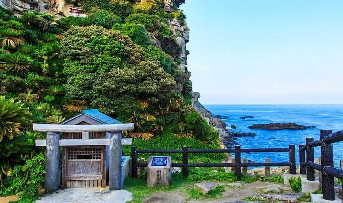都井岬の駐車場から階段を下りると、崖の中腹に小さな神社があります。土砂災害の懸念のため、最上部の神社への立ち入りは制限されていますが、下の拝殿からは絶景を楽しむことができます。真っ青な太平洋が目の前に広がり、断崖絶壁に3,000本以上のサゴヤシが生い茂るこの神社は、まさに畏敬の念を抱かせるものです。串間を訪れる際は、都井岬の野生馬ツアーと合わせて、ぜひ御崎神社を旅程に加えてください。