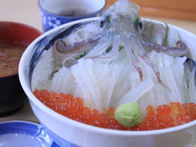 一華亭たびじは、店内の生け簀から活きたイカを目の前で調理する「踊る活イカ丼」が目を引く店として知られています。見た目も美しいだけでなく、揚げたてのイカは甘くて最高に美味しいです!こちらのメニューはすぐに売り切れてしまうことが多いので、早めの来店がおすすめです。