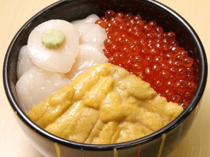 函館朝市で最初に海鮮丼を提供したお店として知られる「菊代食堂」では、ウニ、イクラ、ホタテをトッピングした絶品「元祖函館巴丼」を提供しています。新鮮なイクラが美しく輝き、ウニやホタテの見た目も鮮やかで、函館朝市でぜひ食べていただきたい一品です。