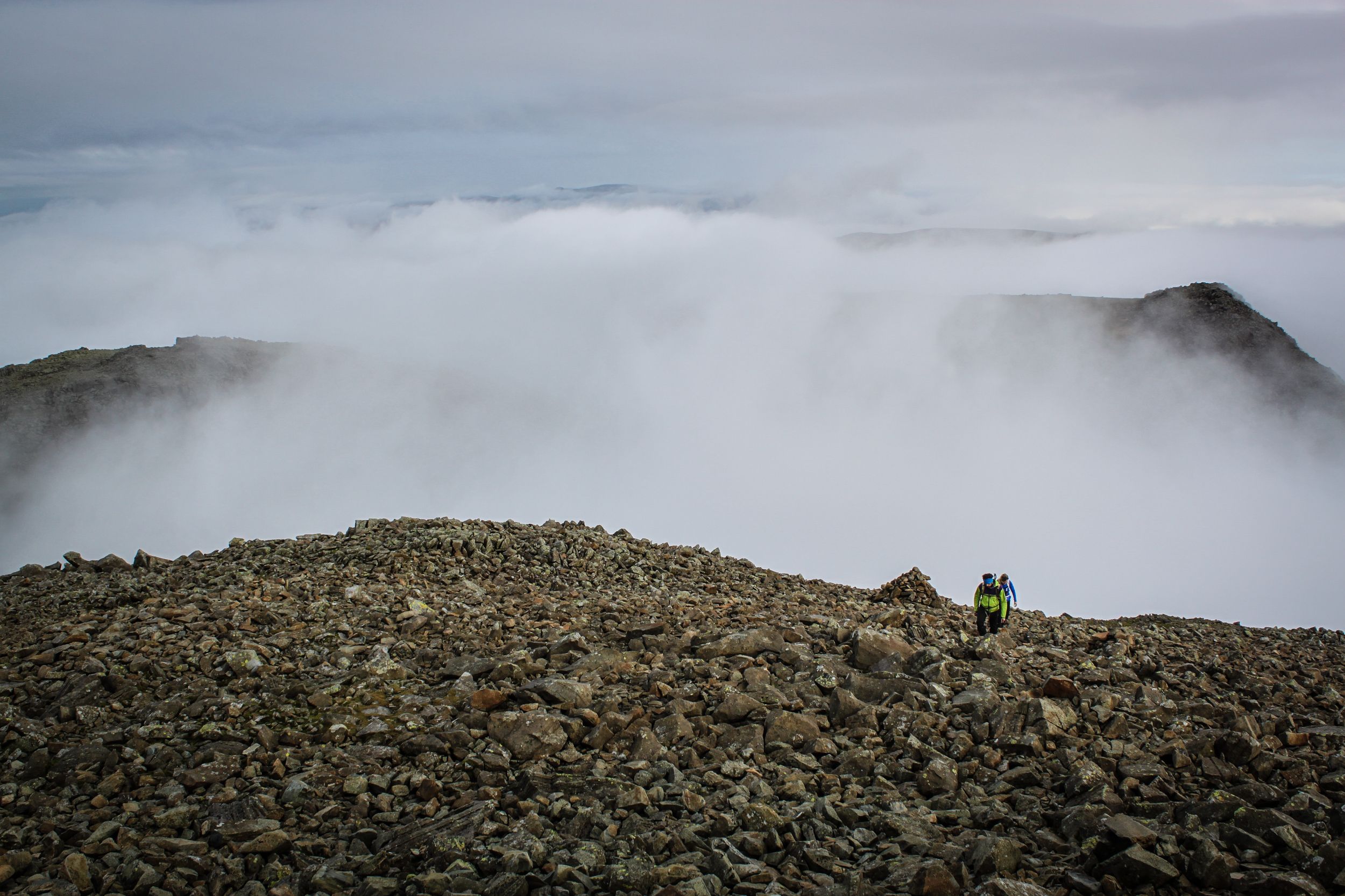 結果は素晴らしいものです。 2時間の登山の後、私たちは澄んだ空気の中にいて、厚い雲の上を闊歩しており、足元の音はすべて鮮明に聞こえます。頂上ではイギリスで最も腹を空かした高尚な男たちとして、ソーセージロールとリンゴをむさぼり食う。
