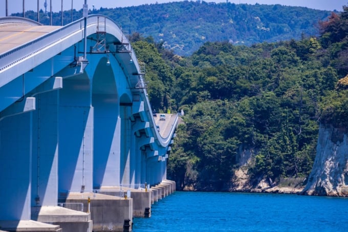ツインブリッジ能登は、能登島の西側にある七尾市中島町と能登島を結ぶ全長620mの橋です。優美な能登島大橋とは異なり、エッジの効いたイメージの橋です。