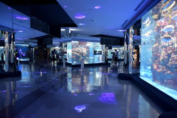 全長22mのトンネル水槽には1600トンの水がたまり、イルカやフンボルトペンギンが素早く泳ぐ展示エリアです。 「ジンベエザメプール~青い世界~」では、巨大なジンベエザメが悠々と泳ぐ姿も見ることができます。