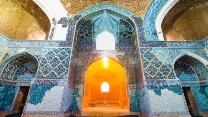 タブリズを象徴する最も象徴的な歴史的構造の1つは、青いモスクです。タブリズが首都だったとき、それは1465年にカラ・クオンル(黒い羊のタークメン)王朝の5番目の支配者であるジャハンシャによって建てられました。しかし、モスクは1780年の地震で崩壊し、玄関の壁と基礎の一部のみを残しました。 1973年に元の石と伝統的な建設方法を使用して再建されるまで、それは長い間廃inに残りました。