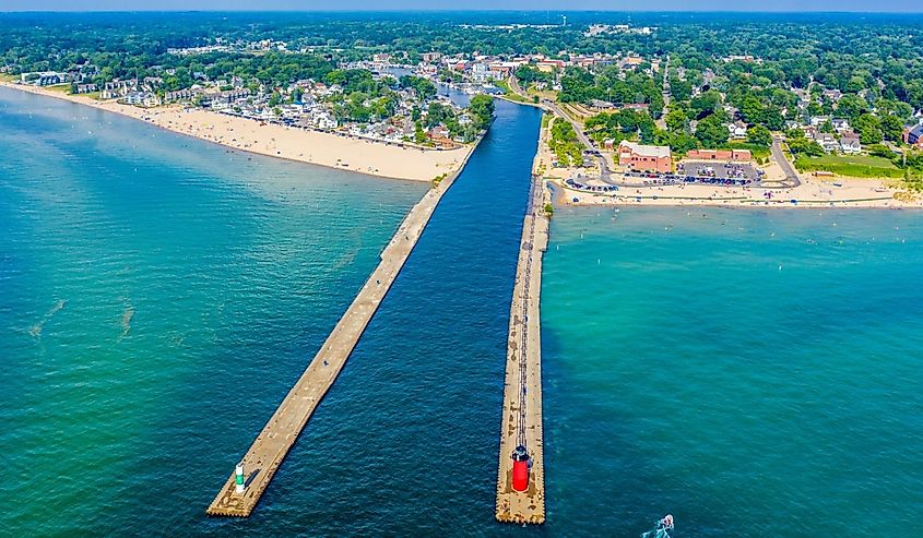 ミシガン湖のサウスヘブン灯台の上空からの眺め。