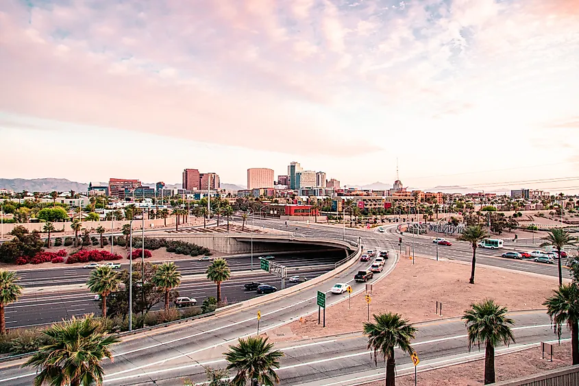 アリゾナ州フェニックスのダウンタウン、夕暮れ。