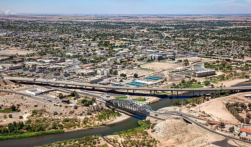 亜熱帯の高圧システムは雲の形成を制限し、周囲の山々は水分が移動するのを妨げます。ほとんどの日は測定可能な降雨なしに通過します。嵐が到着すると、彼らは通常、夏のモンスーンに結び付けられます。コロラド川からの灌漑は、レタス、柑橘類、およびその他の作物の大きな畑を支えており、砂漠の都市が非常に限られた天然水にどのように適応するかを示しています。