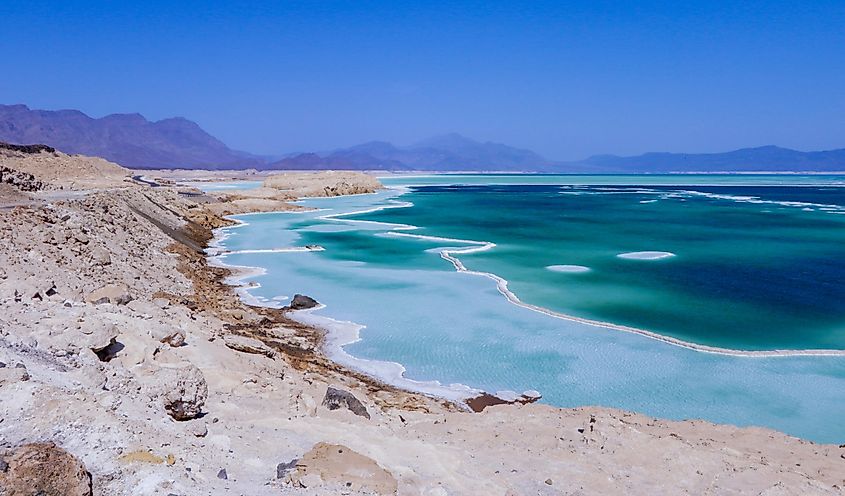 ジブチ中西部のアッサル湖は、アフリカで最も低い海面下 155 m に位置するアファル三角地帯の火口湖です。塩分濃度は海水の約 10 倍で、最大約 35 ~ 40% の塩分が含まれており、世界で最も塩辛い湖の一つにランクされています。主に近くのタジュラ湾からの地下流入によって供給され、激しい蒸発によってのみ水を失うため、NaClが豊富な広大な塩の地殻を形成します。何世紀にもわたって、遠方のキャラバンはその「白い黄金」を取引してきました。現在、大規模な産業用鉱区では年間数百万トンが採掘されており、この地域は保護対象としてユネスコの世界遺産に登録されることが提案されています。