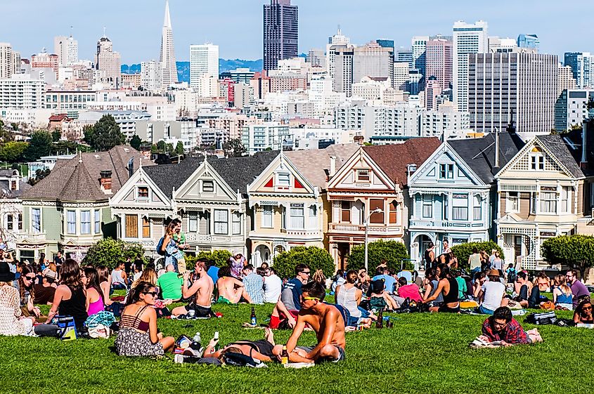 米国カリフォルニア州サンフランシスコのペインテッド・レディースのアラモ・スクエアで晴れた日を楽しむ人々。編集クレジット: Hayk_Shalunts / Shutterstock.com