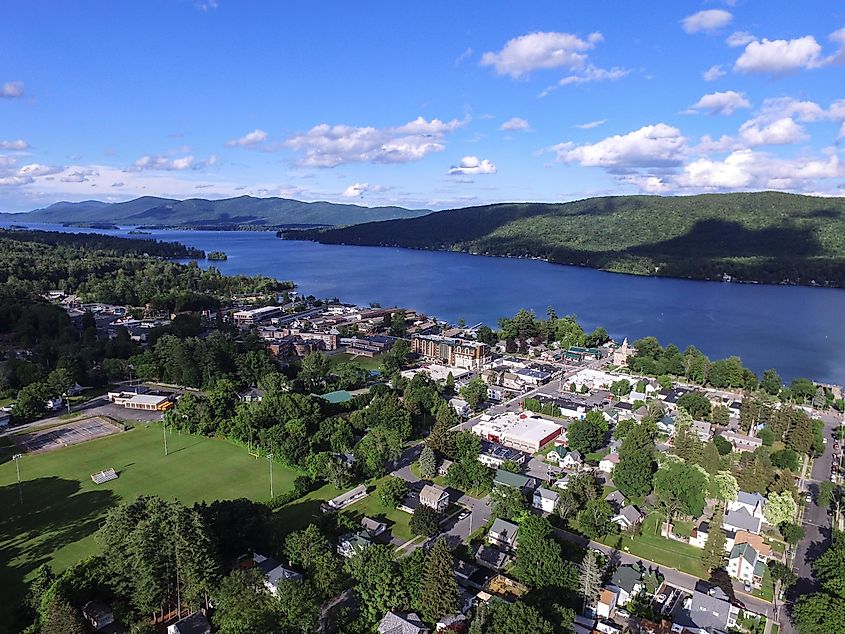 ニューヨーク州レイク ジョージ ビレッジの空撮。