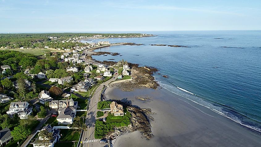 メイン州ケネバンクポートの海岸線の空撮。