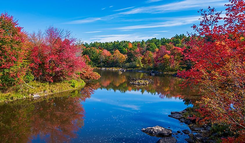 エルズワースは、メイン州の海岸近くのユニオン川沿いに位置しているため、メイン州で最も激しい秋の景色を誇っています。ありがたいことに、ここの観光を楽しむ方法はたくさんありますが、ダウンイースト風景鉄道に乗るのが最もユニークです。この歴史ある鉄道は、州内でも数少ないこの種の鉄道の 1 つで、秋の美しさを背景に、松林の中や透き通った水に沿って年代物の車両に乗ることができます。所要時間は通常 90 分で、景色を満喫したり、地域について学ぶのに十分な時間があります。鉄道から離れたエルズワースには、秋の旅行者を楽しませるトレイルがいくつかあります。