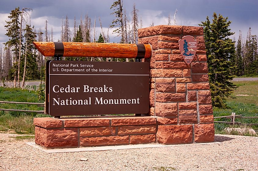 シーダーは国立モニュメントパークのサインを破ります。編集クレジット:Josh Ausborne / Shutterstock.com